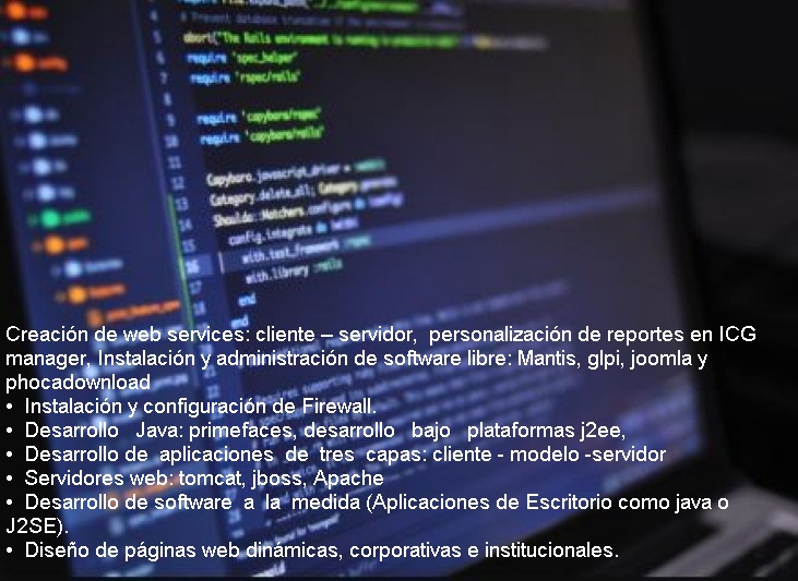 Diseño de páginas web estáticas, dinámicas, corporativas e institucionales, desarrollo de aplicaciones, software y apps móviles, bases de datos, inventarios, cuentas, entre otros.