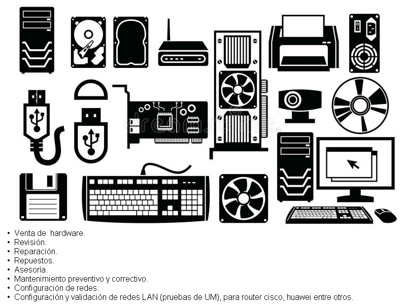Ventas, instalaciones, mantenimientos preventivos y correctivos, diagnóstico, configuración de redes, reparación de equipos.